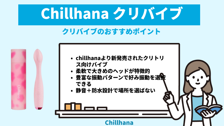 Chillhanaから新登場したクリ責め特化のバイブです。10種類の振動パターンが搭載されていて、どのレベルの振動でも振動音はとても静かとなっています。小さめサイズで先端部分が柔らかいデザインとなっているので、手の小さな女性でも扱いやすくおすすめとなっています。